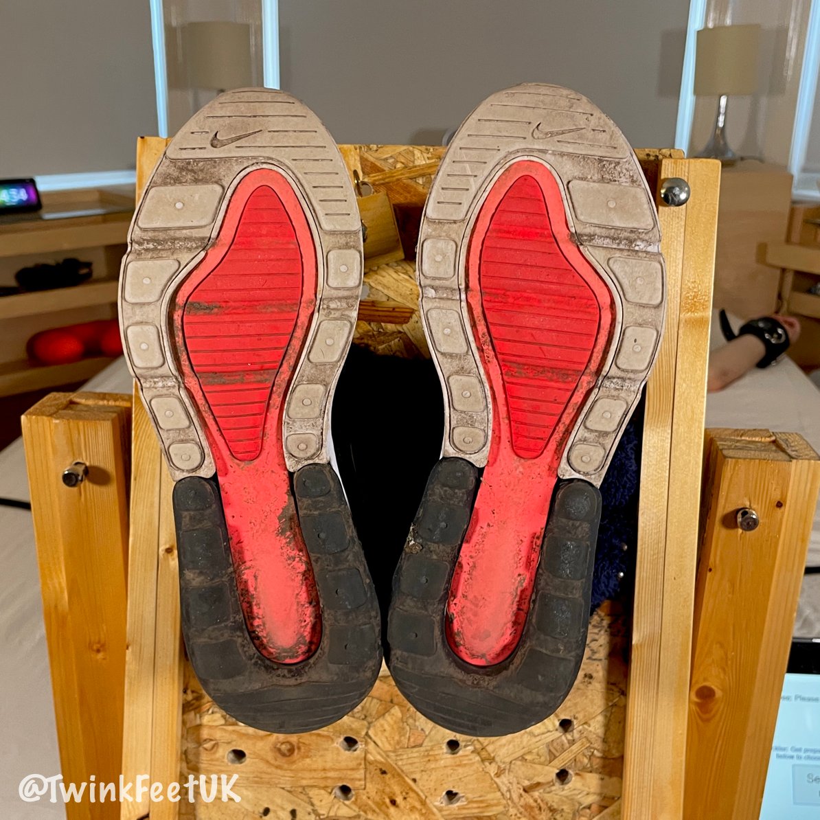 Here are photos I took during the tickling session with #GaggedTwink. Make sure you watch the video if you haven’t already. I took lots of photos at each stage of the session; trainers on, socks on, toes unsecured, toes secured, clean, pen on his soles, oiled, and red after tickling.